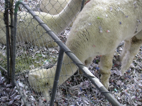 自分のところのを食べずにとなりのブースの草を食むパカ